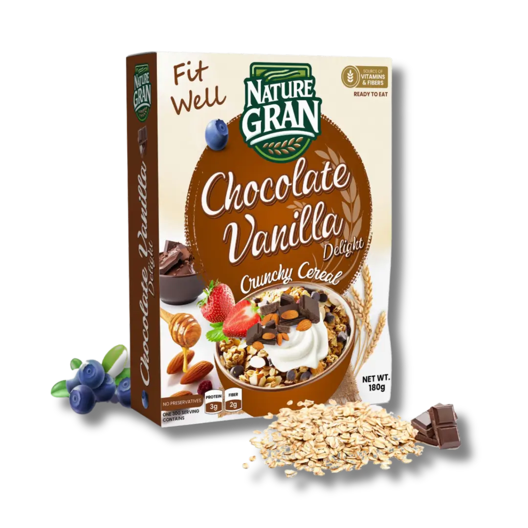 Nature Gran's Chocolate Vanilla Crunchy Cereal is a delicious and nutritious blend crafted for those who crave a perfect balance of indulgence and health. Made with wholesome wholegrain rolled oats, it delivers sustained energy and fiber, while the puffed rice adds a light, crispy texture. Crunchy almonds bring a satisfying bite, and the richness of coconut oil enhances the smoothness of each ingredient. Sweetened naturally with honey and brown sugar, this cereal is taken to the next level with the addition of decadent chocolate chips, offering a delightful touch of sweetness. A pinch of salt rounds out the flavors, creating a cereal that combines the comfort of chocolate and vanilla with the goodness of natural ingredients. Perfect for a morning treat or a quick snack!